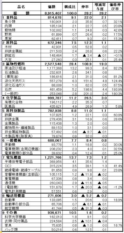 4.2022年4月の商品別輸入と主要品の価格伸び率