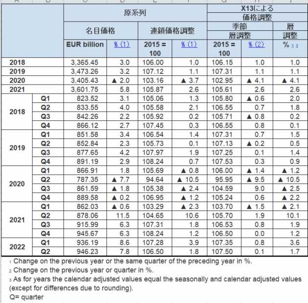 原系列の「名目値(単位:10億€)」と前年同期比、