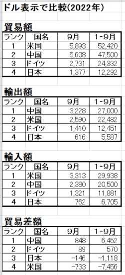 2022年9月と1∼9月の貿易と収支