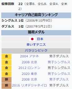 計50回(シングルス28回、ダブルス22回)優勝の記録