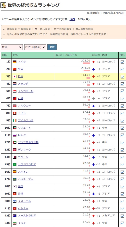 世界の経常収支ランキング~2023年