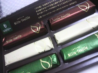 千疋屋 ミルフィーユ抹茶柚子千疋屋で発売されたばかりのお菓子です値段は1050円(6本入り) 千疋屋のホームページをたまたま見た時に、 「これ絶対食べたい!」と思って買いに行っちゃいました「スウィートブルーベリー」「ホワイトストロベリー」「抹茶柚子」 の3種類が2本ずつ入っています。 これが(色味でわかると思いますが)↓抹茶柚子美味しかった~さすが千疋屋!3種類共、フルーツの味がしっかり感じられました★ 抹茶柚子も、抹茶チョコがくどくないし柚子と合っていて美味しい! サクッとする食感もいいですしね。