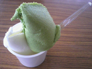 とあるアイス屋の抹茶ジェラート値段は300円 2種類選べて300円は安い♪チェーン店じゃない、とても小さなお店でした。 写メを見てもわかる通り、盛り方がすごくテキトーw ・・・かと思いきや、下のジェラートがたっぷり入ってました抹茶ジェラート、濃厚で美味しかった~なめらかな口どけ(舌触り?)で、くどくなかったし、 甘ったるさもなかったので良かったです。