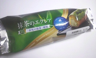 モンテール 抹茶のエクレアそういえば去年の春にも同じものが出ていたような♪ 値段はスーパーで96円(定価126円) エクレア大好きなので、やっぱり抹茶味は嬉しい相変わらず、モンテールのスイーツはクリームがたっぷりでたまりません ちゃんと端っこまで抹茶のクリームが入ってます。 味としては、さっぱり系ですね! 美味しいんだけど、コーティングされている抹茶チョコレートは、 なんだかちょっとだけ惜しい気がする。 見た目的にも抹茶チョコをコーティングするのは正解だと思うんですが、 ミルクかビターチョコレートの方が、味覚的にはおもしろいかも。 私個人の意見では、そっちの方が美味しいんじゃないかなって思いました
