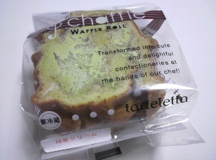 タルテレッタ 抹茶クリーム(ワッフル)ここのお店、関西では名の知れたお店なのでしょうか? 値段は126円 プランタン銀座の地下2階に、期間限定でお店が出ていました。 以前、他の場所で催事で出ていたのを横目で見つつ通り過ぎてしまったことがあるので、 「今回見つけたのも何かの縁かな」と思って、購入! 見た目でちょっと損しているかも、このワッフル!もっとワッフルがパサパサしてるのかと思ったら、 すごーくふわふわなんですスポンジケーキのような♪ 抹茶クリームは、甘いけど美味しいっ!うん、好きです抹茶が苦手な人でも食べられる系のスイーツだと思いました。 タルテレッタのワッフルは、去年「笑っていいとも」で取り上げられたらしいです♪