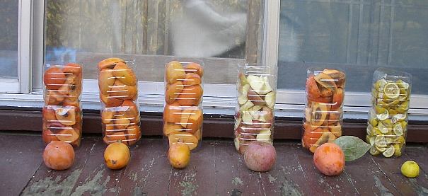 気温が下がってきて干柿も綺麗に出来るように為った。干柿は「渋柿」を甘くする一手段だが「甘柿=富有柿」の干柿の味はと試してみたがこれがいける。 渋柿の干柿は食するタイミングが早いと口中に渋みが残りへいこうする。 ところが甘柿は元々渋くないので何時食しても大丈夫。干す前より数倍の甘さが堪能出来る。 難点は渋柿に比べてカビが生え易いことだ。 カビ対策を鋭意検討中である。 11月20日の86netさんのブログに「柿酢」の事が掲載されていた。よしワシも挑戦しようと畑から「渋柿2種」「富有柿」とお遊びで「林檎」と「柚子」を採取し瓶が無いのでペットボトルに詰めて柿酢造りに挑戦を開始した。 86netさんのように「酢にはにつかぬ、りんごジュースににた実にまろやかな飲み口のよい味」に遭遇できるのか3ヶ月後が楽しみです。 結果は如何に!! 乞うご期待