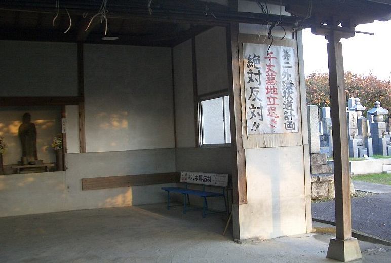 朝の散歩のついでに犬と墓参りをしてきた。こんな言い方をすると、ご先祖様からお目玉を喰らいそうで有る!! 先祖の墓を守れと反対したが『写真の「千丈町墓地立退き絶対反対!!」』のポスターも色褪せ、千丈町の墓も「第二外環状線建設」の関係で移転がまじかに迫っている。 生まれてから今迄、見てきた風景が目に出来るのも後数年と思うと寂しい。 特に、墓に「お世話」になるのも『身近』に迫った歳に成ったと思うとさらに寂しい。 =ご先祖様安らかにお眠り下さい。 南無阿弥陀仏=