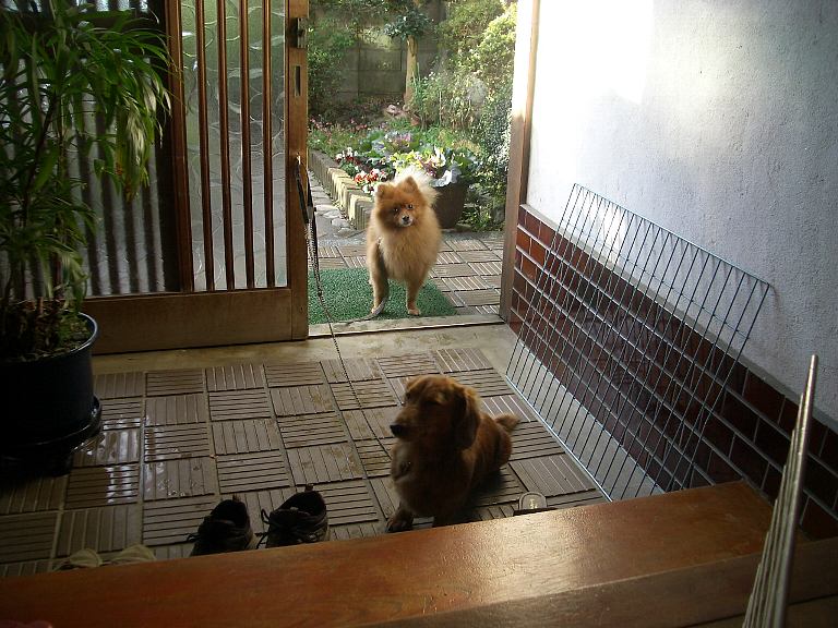 恒例の犬の散歩、散歩の出発時間は7時出発早くせよと玄関で待つ二匹の犬達柿畑も落葉で絨毯をひいた様に裏山は綺麗に紅葉 大原野神社の紅葉も落葉始まる 紅葉を楽しみながらの犬達との散歩ももう暫く。大いに紅葉を楽しんでやろう!!
