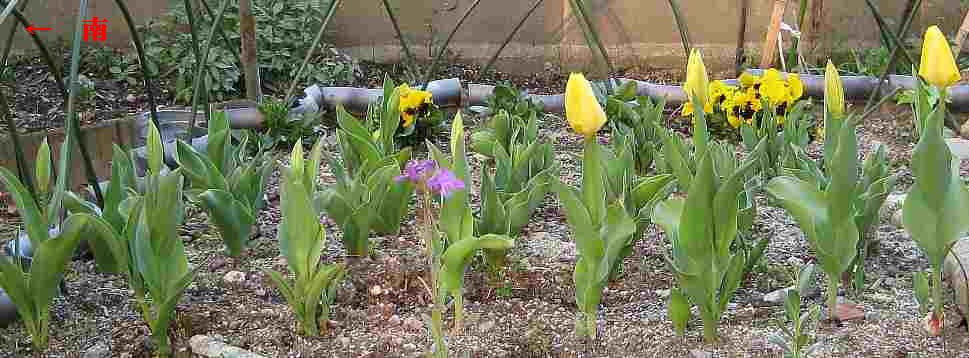 家の花壇のチューリップが咲き出した。 引越前の家で鉢植えにしていたものを移植したものである。 同一品種で同時期に移植したもので有るが、花の咲き方や背丈は右から順に早く背丈も長い。 何故かと不思議になり調査した。 結果は左端から1.7mの所(南側)に1.1mのブロック塀が有り太陽光のあたる時間の差と推測される。 チューリップの背丈も右端は33cm、左端は22cmで有った。 太陽の照射時間によりこんなにも成長に差が出るものかと驚かされた。