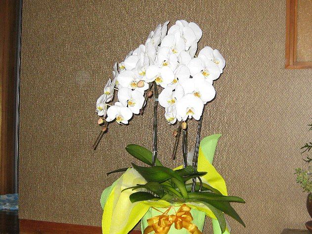 転居祝いにいただいた花を玄関に飾りました。花をいただいたのは長い人生で数度しか有りません。何時までも咲き続けてくれる事を願いながら毎日眺めています。(ラン)(寄せ植え)(チュリップ)