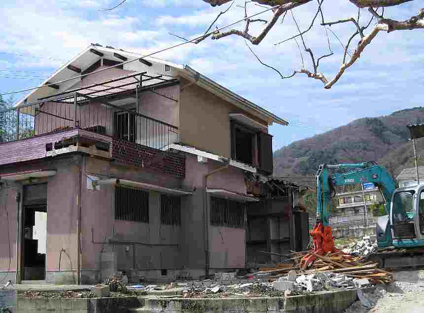 行政から収用対象家屋・土地の更地での引渡しの期限を切られたため業者による家屋の解体が大安の6日から開始された。 解体に当たっては家屋に御免ねと言いながら塩とお酒で清めた。後、2日もすれば50年来住まいした家屋が跡形も無く消えてしまうかと思うと無性に寂しいものである。(解体中の家 東から)(解体中の家 南から)