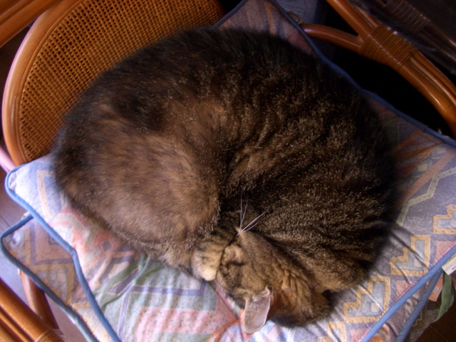 「我が家のラムちゃん過去倉庫【4】」は、「我が家のラムちゃん」http://happy.ap.teacup.com/ramchan/ で紹介した 過去の記事をUPしています。最新のラムちゃんの様子は「我が家のラムちゃん」で、更新しています。「我が家のラムちゃん」の方にも、遊びに来て下さいね! "(*^^)/2008/8/25の記事です。 今年の夏は ほんと~に暑かったです。 室温が 朝から 30度有り、 午後には 33度・34度有る日が普通でした。 日中。。。 外は 毎日猛暑で 35度前後! 夜は 熱帯夜で 寝苦しい毎日! その上。。。 8月に成ってから、 日中は 雨が降らず! 夜中に 雨が降った日が 3日! 空から。。。 飛んでいた蝉が 落ちて来たのを、 見た事が有りますか?Σヾ( ̄▽ ̄)! 「いつまで暑いの?」って思ってたら、 先週の金曜日(22日)から、 朝晩は 涼しくなり、 虫の声が聞こえ、 秋を感じられる様に成りました。 やっと。。。 土曜日(23日)に、 久しぶりに雨が降り、 急に 涼しく成りました。 今日も 雨が降り、 最高気温が23度 最低気温が21度 ほんと~涼しいです。 ラムちゃんも。。。 椅子の上で 寛いだり・・・ フローリングが 冷たいのかなぁ~? ポケェ~~! と 和室で 寛いだり・・・ 畳って 気持ち良いよねぇ~*^^* (∪。∪)。。。スヤスヤ やっぱり猫って。。。 体感温度に 敏感ですねッ!('ω'*)アハ♪ このまま涼しくなると 過ごしやすいのですが、 又 暑くなり まだまだ残暑は 厳しい様です。(*´ο`*) 報告でぇ~す! 夏バテ知らずの ラムちゃん! 何と。。。体重が。。。 6.7キロ 7キロに! Σ( ̄□ ̄;)! 増えました。 間食もしていないし、ご飯も増えていないのに。。。 どうして~σ(・´ω・`*)─??? 9歳で 成長したら ダメだよねッ! "\( ̄^ ̄)゙ハイ!! 最後まで 読んで下さって ありがとうございました。(((uωu〃)ペコリン♪ クリックして頂けると 嬉しいです。o(*゚▽゚*)o 人気blogランキングへ (=^‥^)/。・:*:・゚,。・:*:・゚ ありがとうございました。