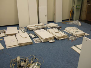 いや~疲れました。三箇日とは打って変わって雪舞う仕事始めの今日は、午前中に事務用品が届きました。今回はあのアスクルに注文。価格も割安感があって、部屋のレイアウトから見積もり、発注までが実にスムースにいき、顧客満足度100点。しかし、専門の方が二人来られれての商品組み立てまでに、なんと7時間近く要してしまいました。いろんなメーカーのものを扱っておられるとのことでしたが、説明書を見ながらの作業は、とても根気の要る大変な作業でした。私にはできないかもしれません。やっと出来上がった後に、PCランの整備。友人でもある信頼する業者さんが3人来てくれての作業で夜10時までかかり先程帰宅しました。ほぼ搬入した荷物も棚に整理し、明日からやっっと本格始動となりそうです。でも、新事務所はやはり気持ちが良くていいですね。↓こんな状態で届きました。↓こうして出来上がっていくのです。