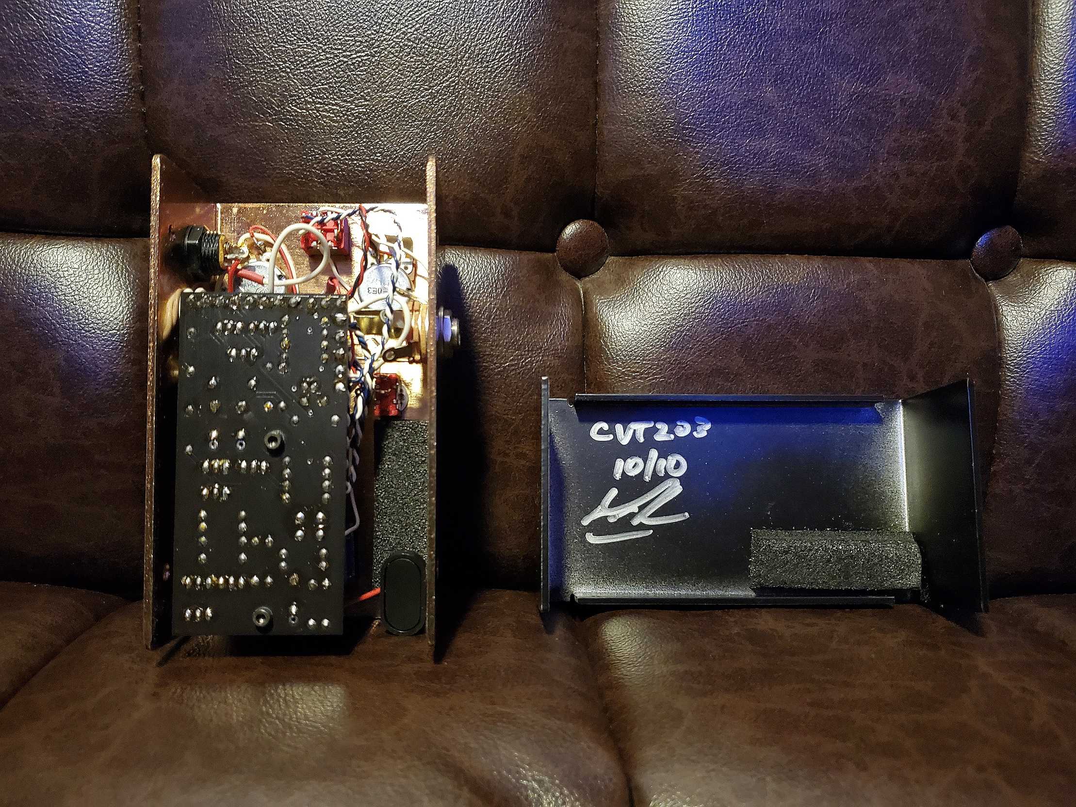 内部基板はこのように裏返して入っていて製造者のサインが入っています。10/10というのは10個限定を指すのか、製造日を指すのかは謎です。大抵エフェクターは中身を見て『このパーツ良いね~』『はんだ付け巧いなぁ』等と眺めたりするのも好きです(マニアック)