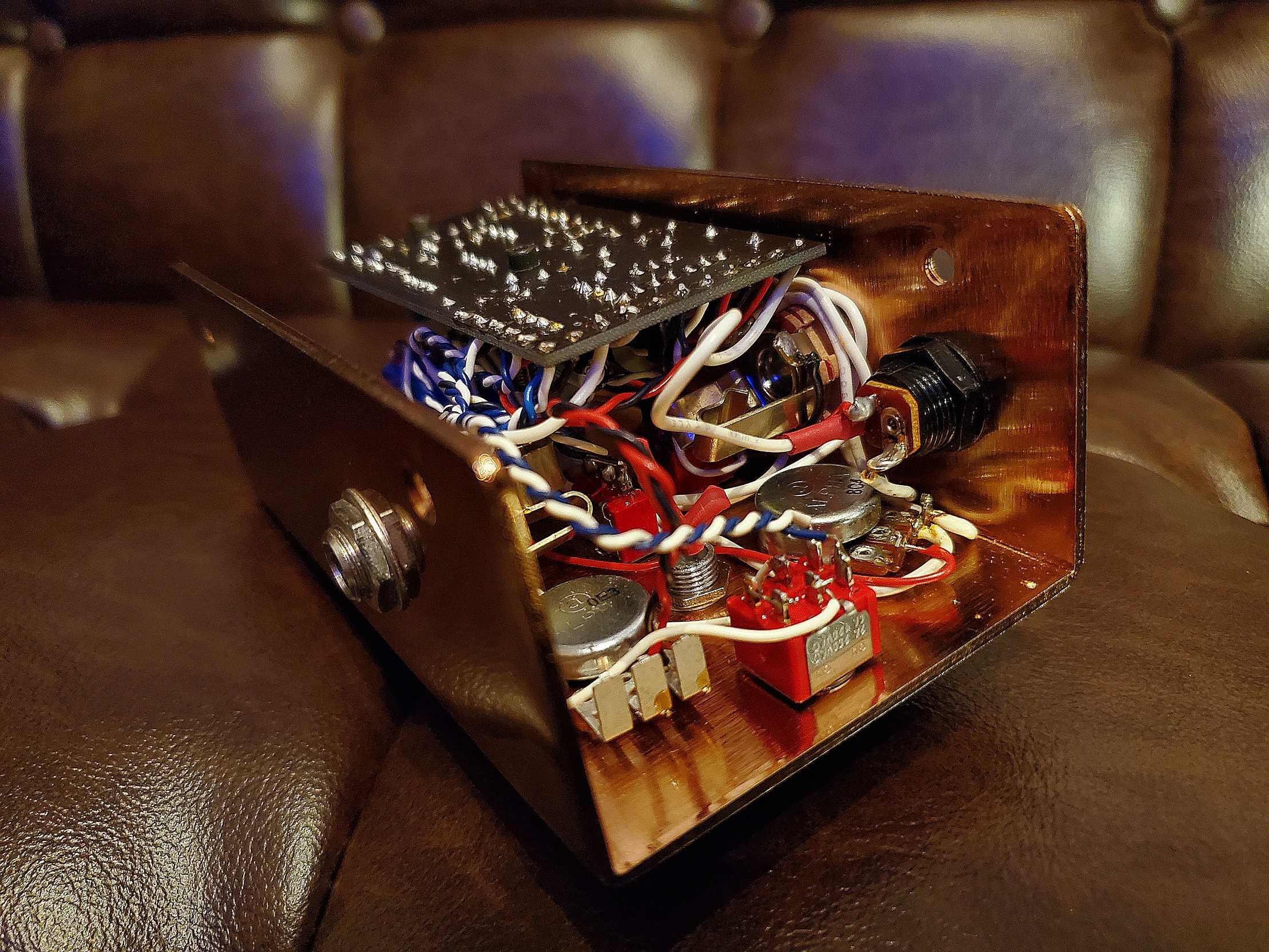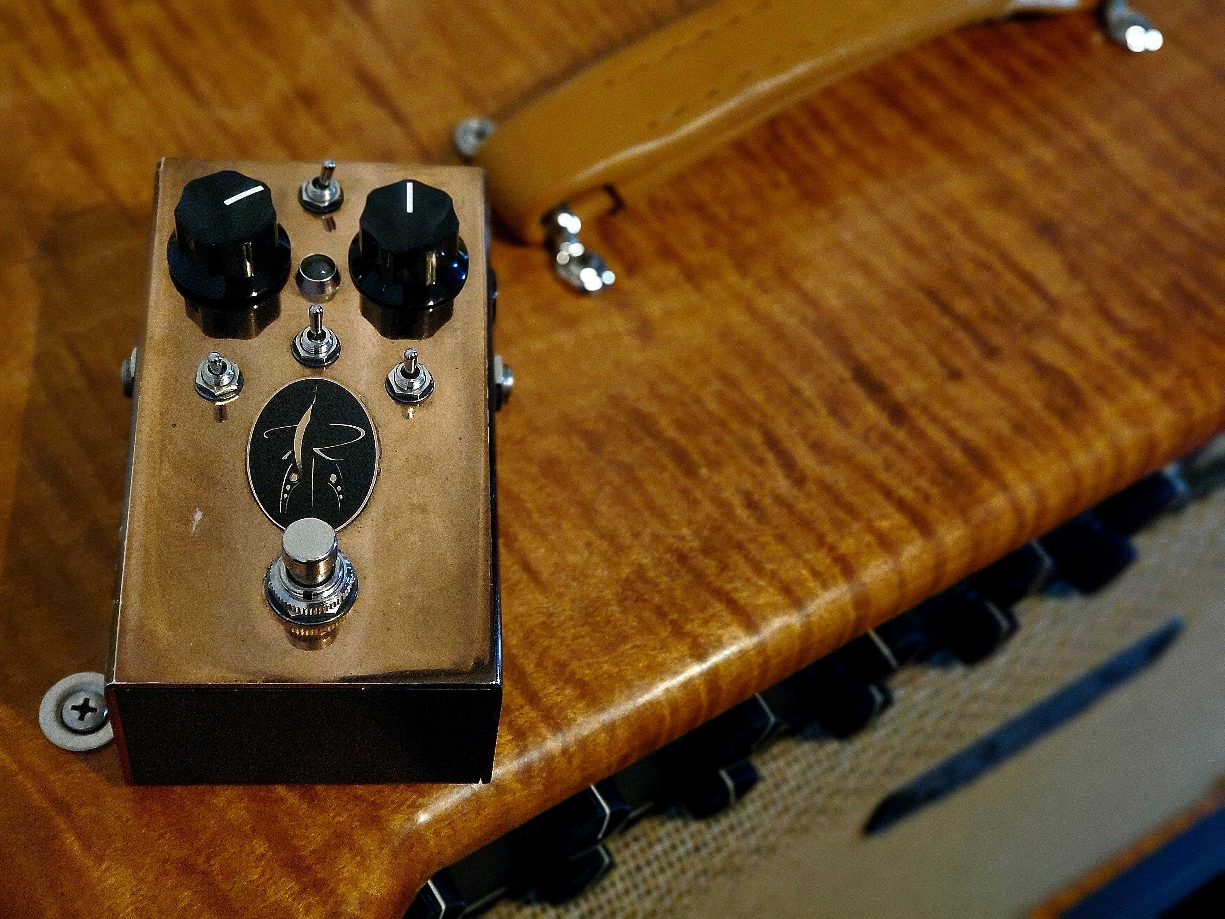 そして今回、ご紹介致しますのはそんな  J Rockett Audio Designs  のカスタムショップ(つまりは最上位)の『 Rockett Boost 』なるものをGETしてみました。 まず単純にブロンズに輝く格好良さ・・・2ノブというシンプルな造形に対して複数配備された謎のトグルスイッチ達が『 一筋縄ではいかない。コイツが只者ではない。 』という内に秘めたポテンシャルを主張している様にも見て取れます。