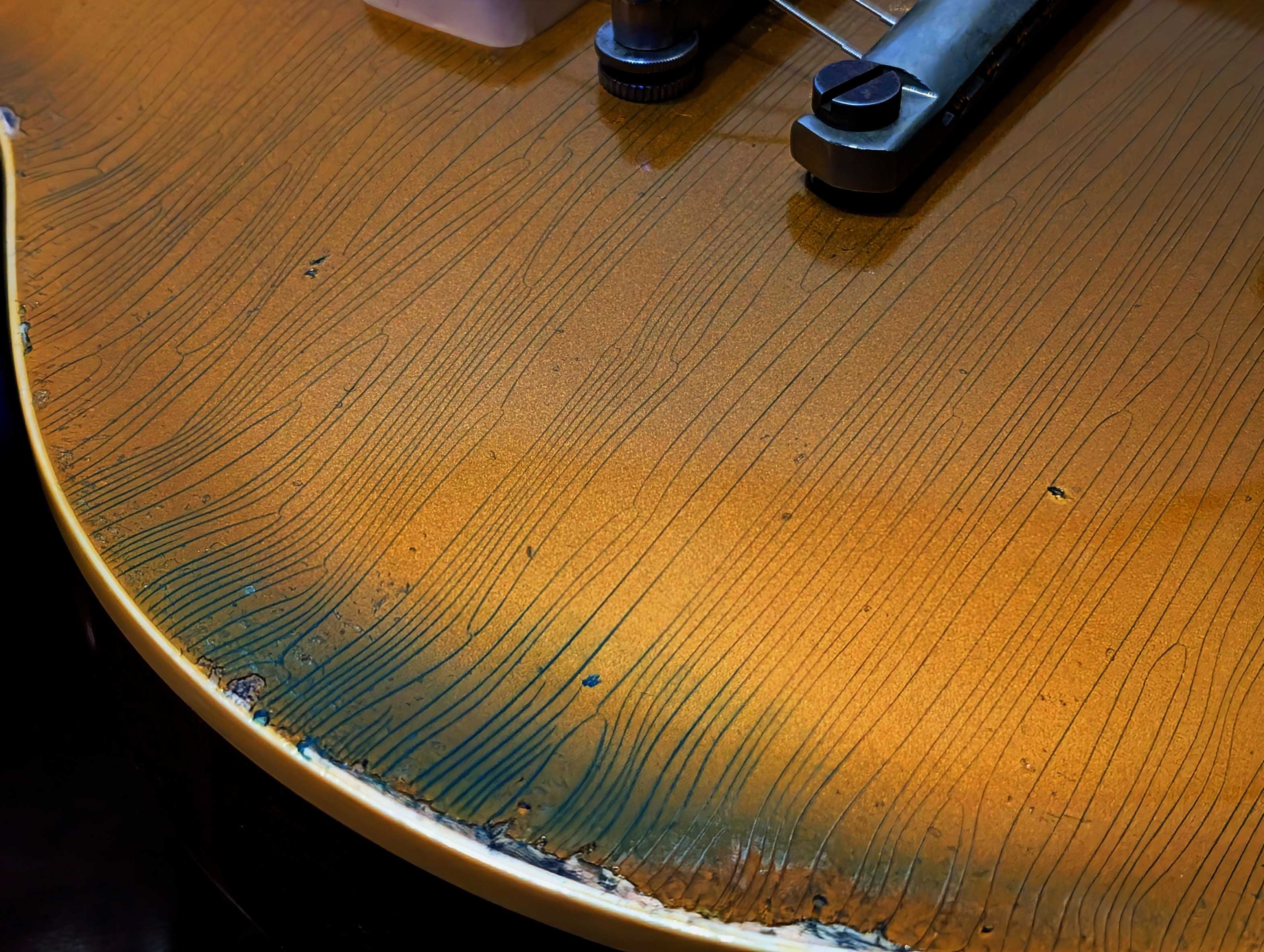 そんな当時と今とを比べれば、まず塗料(成分)が違いますね。明確に違うのは塗料の中にブラスパウダーと呼ばれるブラス(真鍮)の粉を混ぜてあるか否かで、本物と言われるヴィンテージものはコレを用いています。 本物のブラスを使うとどうなるかと言うと、見た目で言えば通常の塗装よりも金属質で高級感が出ると同時に成分が本物の金属故に水分や空気と触れて酸化することで緑がかった錆(緑青)を発生させます。その変色した経年変化がギタリストの中では『 ​ナウい!​ 』とされているとか。。