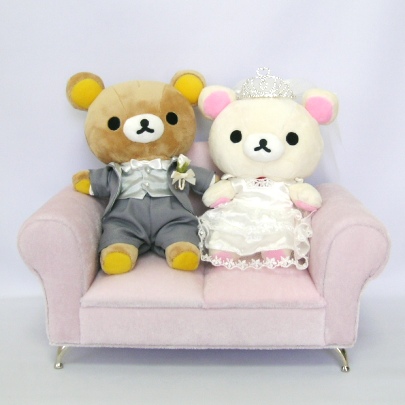 ウェディング リラックマ&コリラックマ くったりぬいぐるみS エレガントソファ・ピンク付き リラックマにタキシードとコリラックマにドレス着せたセットです。 かわいい! タキシードの色はブラックもありますよ。 このセットにハートのクッション 大をつけるともっとラブリーになりますよ。 参考にどうぞ。 ぬいぐるみショップ チコの森