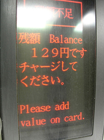 今日久々に定期券外の方面へ電車に乗りました。ウチの区間では隣駅までの最低料金が130円なのですが、定期券を使えないためスイカを使いました。なんとなーくチャージした覚えがなかったので不安に思いながらタッチすると、案の定残高不足だったのですが表示が・・・・129円よくもまあこんなぴったりと・・・そんな一日・・・