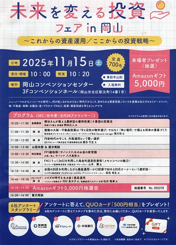 _RSKの主催の「未来を変える投資フェアin岡山」に参加。 午前、午後と7つの講演がある。 会場のコンベンションセンターは、700人で満席。 お目当ては、株式優待投資家の桐谷さんの講演。 優待に振り回されて、自転車を漕ぐ桐谷さんは、よくyoutubeで見ているが、生で話しを聞くのは初めて。 桐谷さんは、優待でもらったリュックを背負ったままでの講演。 身に付けているので、現金で払わざるをえなかったスマホ以外は、全部、株縫い醜態でもらったとのこと。 画面を通して見るのと同じで、とても実直な方で話も楽しかった。 桐谷さんは、広島県竹原市生まれで、こどもの頃、お父さんの用事で月に1回、岡山に来ていたので、竹原駅から岡山駅までの全21の駅名を覚えていたとか、池田動物園にもよく行っていたとか言われていた。 主催者には申し訳ないんだけど、桐谷さんの話しだけ聞いて退席。客席は、一気に半分くらいになって、2番目の講師の方は気の毒だった。コンベンションセンターは700人で満席。 ということで、昼食は一番街のはしや、イオンラウンジでコーヒー、夜は「鮮や一夜」で家族でファジアーノ残留決定祝い、データ通信は楽天と桐谷さんを見習って、今日は株主優待三昧な一日にした。 投資家と言えば、日々、トレードを繰り返して売買益を稼ぐタイプもいれば、一度購入した株はじっくり保有して桐谷さんのように株主優待を楽しむタイプもいる。 あとは、高配当株を保有して、毎年、しっかり株の配当金も貰えるようにして、仕事を辞めてファイアーを目指す人もいる。 たとえば、NISAの非課税保有限度額は1,800万円のうち「成長投資枠」の限度額1,200万円で高配当株を保有すると、配当利回りを4%として計算すると、毎年48万円の配当を受け取ることができる。 これでは、全然、仕事を辞めるというレベルでは無いが、充実したサポーター生活の一助になるだろう。 企業の業績により、配当は増額されていき、将来的に年間配当が100万円を超えるようになると、シーパス代、アウェイ全試合観戦などの全ての費用をまかなうことも夢では無いと思う。もちろん、よりリスクを抑えて、積立投資をするのでもかまわない。にほんブログ村