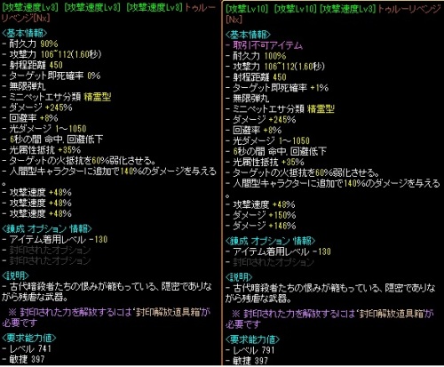 またブログ(´`)前回のはパスワードがryRSの方は、しばらくやっていませんでした。大学を卒業後、実家に帰ってきてから家の都合で7月頃まで予定がたてこんでいたので、RSは月に1回inするかどうかといったところでした。一応ある程度余裕ができたので、inしようとおもったらいつのまにかPCつかなくなってたので、新しいPCかってしまいました<>車も買ってしまったので、貯金が・・・(;´д`) ま、そんな訳で以前のように狩りしたりは無理ですが、Gvだけだったりチャットしにいったりとまた少しずつinしていくとおもいますっお金ももってても意味がないので、一部の人達に9割分散!役立ててくれればそれで満足です(*´д`*) 装備は最後に作ったのは3月だか2月だったか忘れたけどそのあたり!そこそこ整ってはいたけど、まだ改良すべき点が山積みだったので少し心残りではありますが、この装備でこれからもやっていこうとおもいます(*´д`*)その内、ステや装備全部載せようと思いますっとりあえず武器だけ左のほうは主に3フレをするとき右のほうは主に4フレをするとき相手によって3フレと4フレを使い分けています!というか使い分けていた気がしま す!しばらくGvでてないからry 4フレくらいなら武器に1OPついてれば十分ですね(´д`) Wダメにするのが一番めんどくさかった記憶がある。T速度ブレイブももっていましたが、友人がほしがっていたので売却 次回はまたどこかSSのっけますっ ではこの辺で! のっちよー(・∀・)ノ