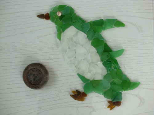 宮古島から移住して初めてのペンギンやっと、ブログを更新する気になりました。相変わらず、ビーチグラスやサンゴ破片で作品作りをしています。そこで、最新の作品制作過程をご紹介しましょう。 (以前からの読者の皆さんにはおなじみですが)透明な板ガラスの上に、宮古島の浜辺で拾ってきたビーチグラスを接着し、ペンギンが一応完成です。グラスは一切加工していませんので、結構隙間が大きいです。で、極小ビーチグラスで、大きめの隙間をふさいで・・・。それでも、小さい隙間がいっぱい開いています。次は、小さい隙間にセメントを入れていきます。隙間からはみ出している余分なセメントを、乾かないうちに全てふき取ります。よちよち歩きのペンギンに見える!と自己満足。でも、空白部分は、板ガラスの向こう側が見えたままです。もっと、ペンギンの姿を浮き上がらせるために。空白部分(ガラスを置いていない背景)に、接着剤を塗っていきます。ビーチグラスとの接触部分(特に角の隅)にまで、もれなく・均一に・・・。しかも、乾かないうちに素早く・・・。塗り終えたら、すぐ、白い砂(宮古島の駐車場隅に吹き寄せられた砂)を均一に・ ↓ (浜辺の砂を持ち帰るのは環境破壊につながりますので)まんべんなく振りかけていきます。接着剤が乾くまで(今なら、1晩)そのまま放置しておきます。写真が多くて少々長いブログになりそうですので、この後の工程は、明日のブログでご紹介したいと思います。