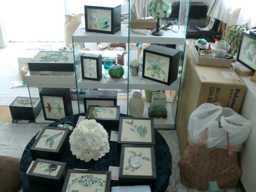 宮古島から移住して展覧会の様子 3ここ数日、展覧会の来場者の方からご依頼のあった作品作りに試行錯誤していました。形・色合い・接着剤など、いろいろと試したんですが、その結果、実用品としての強度を保てないので、当面、断念しました。接着剤と製法を中心に、今後も研究していこうと思っています。さて、12日迄開催していました家族展に出展した私の作品紹介の第3弾です。下の作品が「クラゲの家族」、上に乗っているのが「イカの家族」です。ホンワカした雰囲気を表現したかったんですが・・・。右の小さい額は「隠し絵」です。普通に見た時と、後ろから光を当てた時で、違った絵が見られるんですが、写真1枚だけではわかりにくいですね。次は、最近作り始めた「図案シリーズ」です。右は「四方鶴」、左の下は「図案1」、上は「海月(クラゲ)」です。意図的に小さいビーチグラスを多数使うことで、落ち着きの中にも輝きを持たせようとしました。次の写真も小さい作品で、3作品ともに図案シリーズです。ビーチグラス絵3作品の手前に「球形ランプシェード(ミニ)」と「シャコガイ」を置いてみました。最後は今回最後の作品紹介ですが、これは数年前に作った作品で、親戚の人の結婚記念に贈呈した「ヒトデ」です。贈呈したため、これまでの個展(1~3回)で出展したことがなかったんですが、今回初めての出展です。真ん中の丸くて厚みのあるビーチグラスは、ガラス製浮球(居酒屋で吊るしてある)の底の部分です。ヒトデの触手(下の左右両側)に、珍しい濃紺のビーチグラスを使用しました。中央触手のポイントとして使った赤いビーチグラスは極めて珍しいです。 (これまで1万個以上ビーチグラスを拾いましたが、 赤色はたった3個しか拾えていません)この作品を作っている時の力の入れようを、今でも覚えています。手前の貝は、左から「夜光貝」「ヒロセ貝」「タカセ貝」です。夜光貝とヒロセ貝は、内側の真珠層が見えるまで、外側の層を手作業で研磨した物です。