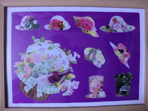 宮古島から移住して展覧会の様子 4 これまで3回にわたって私の出展作品を紹介してきましたが、「家族展 2」でしたので、家族(94歳の母親と姉)の作品も紹介しましょう。 まずは母親の作品ですが、家にある「広告紙・包装紙・カタログ・新聞など」のなかで気に入った部分を見つけると切り抜いて、貯めていたものを額に並べた作品です。2年前開催の「親子展」時は“くつした”を切ってたんですが、今回は“ぼうし”だそうです。 姉は、和服の帯を再生した作品を出品しました。帯の「しん」を取り除き、楕円形につないで、黒・紺・緑などの布を裏地として縫ってあります。 これをどう使うのかといいますと、 上の写真のように着ます。裏表を逆にすると、襟部分に柄が見えて、胴部分が黒になります。母親は30以上の作品(大小3種類の額物)、姉は10点ほど、それぞれ出展しましたので、次回以降、会場全体の様子・来場者の様子とともにご紹介できると思います。次回以降も、お楽しみにしてください。