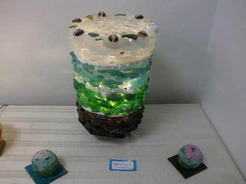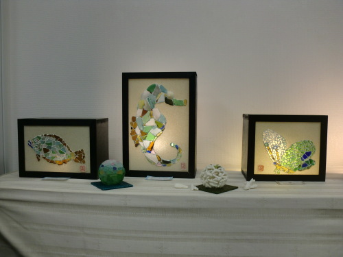 宮古島から移住して家族展の様子2親子3人の家族展は12日(火)で終了したんですが、後片付けや追加製作依頼などの対応に追われてまだ、ぐったりと疲れた状態が続いています。 (歳のせいか、疲れがとれません)でも、皆さんにも展覧会出品作などをご紹介したくて、今日から本格的に作品の写真を掲載します。まず、以前から作っているモチーフ(海の生物たち)で、「ひらめ」「タツノオトシゴ」と、陸上の生き物「蝶「です。以前は、額タイプで作っていたんですが、作品に厚みがない(額)ため、今回出品作は、すべて「箱タイプ」にしました。これだと家のどこにでも置けるし、ライティングもしやすいので。ただし、木工はあまり得意ではないので、箱の細かい箇所で納得のいかない点があり、今後の課題です。手前の丸いのは、球形ランプシエード(ミニ)です。野球ボールより一回り小さいです。球形ランプシェードは、4サイズ目(大・中・小・ミニ)で、これ以上小さいのはできないと思っています。2枚目の写真も海の生き物シリーズで「イルカ」「フグ」です。箱型の作品なので、イルカの上にミニサイズの球形ランプシェードを置いてみました。3枚目の写真は、球形ランプシェードです。点灯している右2個が中型、左が小型、点灯していない後列がミニです。ランプシエードはほかにも筒型(主にサンゴ破片製)があるんですが、数日前にも紹介したビーチグラス製筒型の作品は今回展覧会用に大きいものが必要と考えて作りました。大きさを実感してもらうために再度掲載しましょう。手前のミニ球形ランプシェードと比べてもらえると、分かるでしょうか?大きめのビーチグラスを大量に使って、積み上げていったので、かなりの重量になってしまいました。照明用のコードが押しつぶされて断線しないよう、一番底のビーチグラスを1枚はがして、コードを踏みつけないように修正しました。 来場者の方々の反響は、後日のブログでご紹介するとして、次回も引き続き作品紹介したいと思っています。