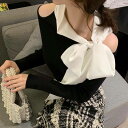レディース ビッグリボントップス カットソー ネックリボンタイTシャツ プルオーバー ニット ボウタイ オフショルダー 肩出し ワンショルダー 長袖 バイカラー 黒 ブラック 春夏 春 秋冬 秋 冬 ゆったり 大人可愛い きれいめ エレガント 上品