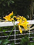 どうもこのところ園芸に関してモチベーションが低い。原因は疲れか、暑さか、蚊か、バッタか、単にそういうバイオリズムなのかよくわからないけれど、放置プレイをキメ込んだ玄関前の寄せ植えやハンギングは見るも無残な状態になっていた。…これにはさすがに反省した。でも、もう花期も終わりみたいだから、一部植え替えて秋の寄せ植えにリフォームしようかな。秋蒔きの種や球根もいい加減蒔かないとなぁ、と思っているのだが、どうにもこうにも腰が重く、休日の度に「今日こそは」思いつつ、今だに蒔けていない。「昨日もそう思った…」とらならいように、今度の連休中になんとかするぞ!写真は庭の端っこで、健気に咲いていたリコリス。前の住人が花壇に植えたものなのだが、あまり気に入らなかったので他所へ移植しようと思い、とりあえず掘り起こして転がしておいたものだ。土もかけられていないのに、それがいつの間に芽を出し、彼岸の時期に合わせて花を咲かせた。ホントに、生命はたくましい。しかも咲いてみると、山吹色と杏色の中間くらいのこっくりとした黄色で、なかなかどうしていい色じゃないの!(自分の記憶の中ではもっと白っぽかった)当時何がそんなに気に食わなかったのか不思議だ。雑草&病虫害で荒れ気味の庭の一角で、ものすごい正のエネルギーを放っている。花に「頑張れよ」と言われてる気がした。力まない程度に頑張ろうと思う。凛と