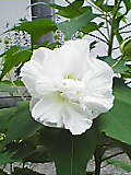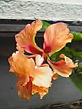 ちょっと涼しくなると、ハイビスカスががぜん元気。こちらは最近お気に入りの「オレンジフラミンゴ」。うちでははじめての2段咲き品種。「フラミンゴ」ってネーミングが効いてるわな。