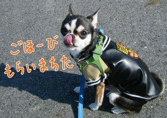 「れんくん、おすわりは?」はいれす!「お~、お外でもちゃんとできるね~。かしこいかしこい♪」わぁい、ごほーびもらえまちた~♪ブログ村 スムースチワワ☆人気ブログランキング☆ふゆは、おそとでおすわりするとつめたいのれす~。