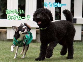 おかたん、れんくん、ぷーどるたんとあそびたいれすっ!「はいはい、でも、ケンカしたり、あんまりしつこくしちゃダメだよ」はいれすっ、きをつけるれす。こんにちはー、れんくんれすー。いっしょにあそんでくらさい☆えへへ~、たのしいれすね~♪ブログ村 スムースチワワ☆人気ブログランキング☆また、あえるといいのれす~♪☆☆☆ひとりごと☆☆☆またまた、お庭わんさんに行ってきました。れんくんは、お庭わんに遊びに来ていた黒いプードルのラッキーくんに、ひたすら「あそぼーれす♪」ってまとわりついてました(^^)いっぱい遊んでもらってよかったね~。また、会えるといいね、れんくん☆