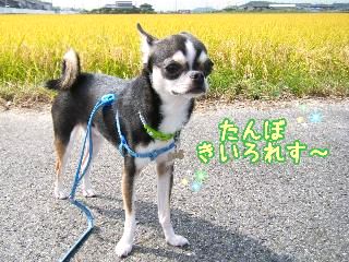 おっさんぽ♪ おっさんぽ♪ おっさんぽ♪「れんくん、楽しそうだねぇ(^^)」あっ、おかたん、たんぼがきいろいのれす~☆なつはみどりのたんぼだったのに、ふしぎれすねー。ブログ村 スムースチワワ☆人気ブログランキング☆なつのおひさまで、たんぼ・こんがりきつねいろになったのかもしれないれすー。