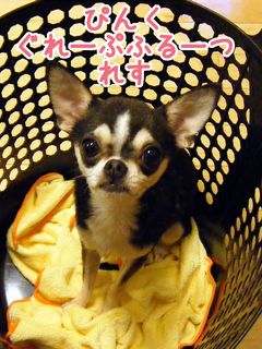 しゃんぷーしてもらいまちた。くんくんくん、これはなんのにおいれすか?「ピンクグレープフルーツの香りだよ♪」れんくん、くだもののにおいになったのれすー☆ブログ村 スムースチワワ☆人気ブログランキング☆てざわりも、つるつるになったのれすー。