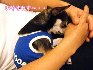おとたん、しゅっちょう、おつかれさまれす。れんくんが、いやしてあげるれす!「あらら、どっちが癒してるんだろうねぇ(^^)」いやすれす~・・・ブログ村 スムースチワワ☆人気ブログランキング☆はっ、れんくん、いつのまにかねちゃったのれすー!
