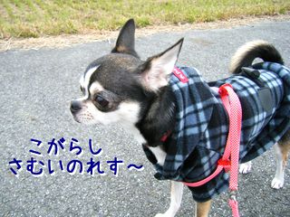 ひゃー、つめたいかぜれすー!「木枯らしが吹いてるんからね」こがらし、さむいのれす~。はやく、おうちにかえるのれす~。ブログ村 スムースチワワ☆人気ブログランキング☆れんくん、さむいのにがてなのれす~。