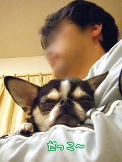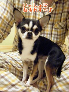 おとたん、かえってきまちたー!「ただいまー、れん、いい子にしてたか?」はいれす、しゅっちょう、おつかれさまれす~☆きょうは、いっしょにねるれすよ♪ブログ村 スムースチワワ☆人気ブログランキング☆は~、おとたんとねんね、ひさしぶりれすー。