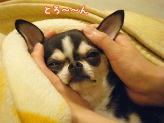「れんくん、お耳マッサージするからおいで~」はいれすー♪は~~、きもちいのれす~。おめめ、とろ~んってなってきまちた。。。ブログ村 スムースチワワ☆人気ブログランキング☆このまま、おひるねするのれす~。