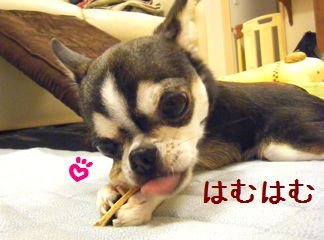 おやつ、おやつのじかんれす!「ちょっと待ってね~。・・・はい、おすわりできるかな?」はいれすっ、できるれすー。はむはむ、きょうもがむ、おいちいれす~♪ブログ村 スムースチワワ☆人気ブログランキング☆「ガム食べ終わったら、つめ切りするよ~」がーん、なのれす~。。。