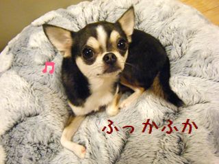 はー、さむいれすねー。「冬用のクッション出したよ~」わぁい、ふっかふかれす♪かいてきなのれす~。ブログ村 スムースチワワ☆人気ブログランキング☆おかたんもつかっていいれすよ♪「ありがとね~、でもちょっと小さいかな~私には(^^;)」
