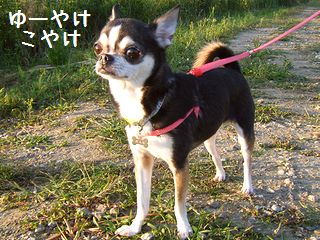 きのうのゆうがた、かぞくでおさんぽいきまちた。おがわぞいのみち、あるいたれす。ゆーやけ、きれいれした。ゆーやけこやけで、ひがくれるのれすー。ブログ村 スムースチワワ☆人気ブログランキング☆おひさま、ばいばい、またあしたれすー。