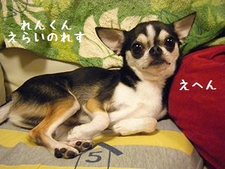 えへん。「わ~、なんかすごく偉そう(^^;)」れんくん、えらいのれす。さ、いっぱいほめるのれすー。ブログ村 スムースチワワ☆人気ブログランキング☆「はい、えらかったね~、今日も歯みがきがんばりました」がんばったのれす、だかられんくんえらいのれすー♪*さかのぼること5分*たえるれす~。れんくん、はみがきたえるれす~。