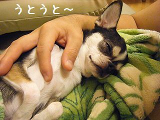 おとたんのおてて、あったかいれすね~。「よーしよし、れんは甘えんぼだなあ」なでなで、きもちいいれす。はー、うとうと~ってなるのれす~。ブログ村 スムースチワワ☆人気ブログランキング☆