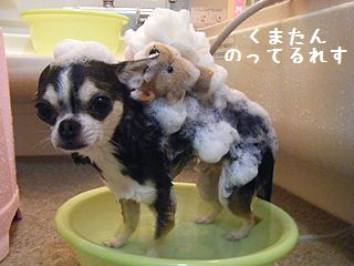 「ちょっと、そのままでいてね~。ブラシブラシっと」・・・せなかにけはいをかんじるれす。「おー、すごい。シャンプー用くまさん落ちなかった」あわあわのくまたん、のってるのれすー。ブログ村 スムースチワワ☆人気ブログランキング☆おかたん、そろそろどけてほしいのれす。「あ、ごめん。あまりにバランスよく乗ってるからつい(^^;)」