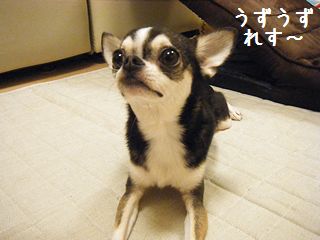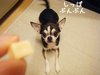 「れんくーん、おやつだよ~」わぁい、ちーずれす~♪「しっぽぶんぶんだねぇ(^^)」うれしいと、ぶんぶんになるのれすー。ブログ村 スムースチワワ☆人気ブログランキング☆ちーず、みわくのおやつなのれす~。