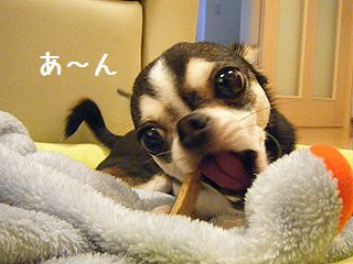 おやつ、おいしいれすね~。はー、しあわせれすー。「わあ、おっきなおくち」それは、がむをたべるためなのれす~。ブログ村 スムースチワワ☆人気ブログランキング☆もうなくなっちゃったのれす~。