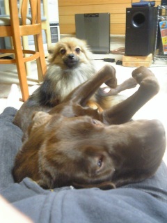 RENOとRANにはお友達がいますヽ(´ー`)ノでも、少し大きなお友達なのでなかなか仲良く遊べませんヽ(;・ー・)ノ大きいだけで、優しいワンちゃんなのに・・・。いいかげん慣れてほしいものです(;´д⊂)この間、ラブのソフィーちゃんが遊びに来た。訓練されてるから、何しても大人しくして待っててくれる♪でも、RANちゃんはまだ恐がってるo(ToT)oソフィーが寝んねゴロンしてる上で『待て』させてみたらビビリながらもしてたw可愛いぃぃ☆☆☆