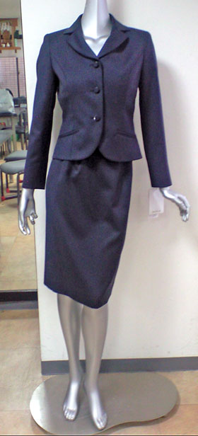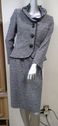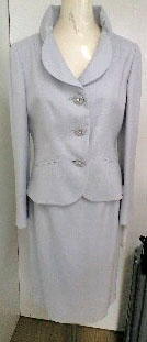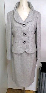 先ほどのスーツと同じデザインの生地違いの商品です。こちらはレーヨン100%の生地を使っています。淡いグレーが少しだけブルーがかっています。そして、同じデザイン・サイズなのにジャケットは縫製の具合か、ほんの僅かですが、こちらの色の商品の方が小さいのです。(11号です)生地の伸縮性にも関係あるかも知れませんね。お値段は同じく、3万9千円です。