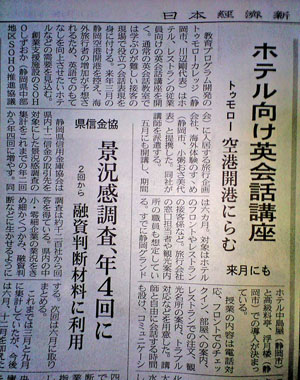 4月18日の日本経済新聞の静岡経済欄に、プロジェクト8のメンバーの「海外体験のすすめ」さんが掲載されました。嬉しいですね~。皆さん、それぞれの分野で活躍されています!